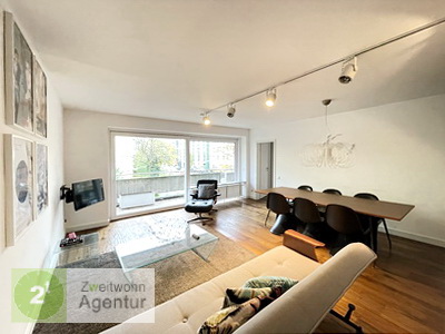 Moderne, helle und hochwertig möblierte 2-Zimmer-Wohnung im 1. OG mit Lift und Balkon der einmal rund um die Wohnung führt. Großes Wohnzimmer mit Fensterfront, Zugang zum Balkon, Couch, Couchtisch, Sessel, Flatscreen-TV (Kabelanschluss), Esstisch, Regalwand, dunklem, hochwertigem Holzboden und elektrischen Rollläden. Separate, komplett ausgestattete, tageslichthelle Küche mit Hochglanzfronten, Cerankochfeld, Backofen, Kühl-/Gefrierschrank und Spülmaschine. Separates Schlafzimmer mit Zugang zum Balkon, Doppelbett (200 x 200 cm), Nachtkonsolen und Kleiderstange. Großes traumhaftes Badezimmer mit ebenerdiger Dusche, freistehender Badewanne, großem Spiegel und Design-Heizkörper. Begehbarer Kleiderschrank mit viel Stauraum im Flur. Waschmaschine und Trockner im Keller. Handtücher und Bettwäsche inklusive.
